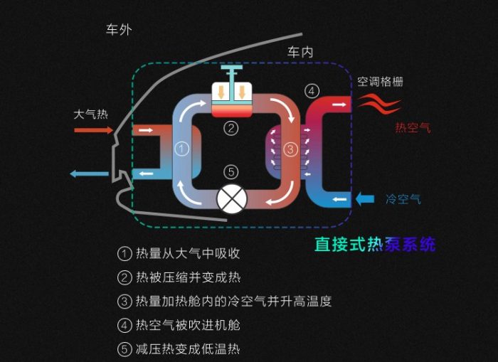 通过蒸发吸热、液化放热消耗小部分电能将外界热量送进车内