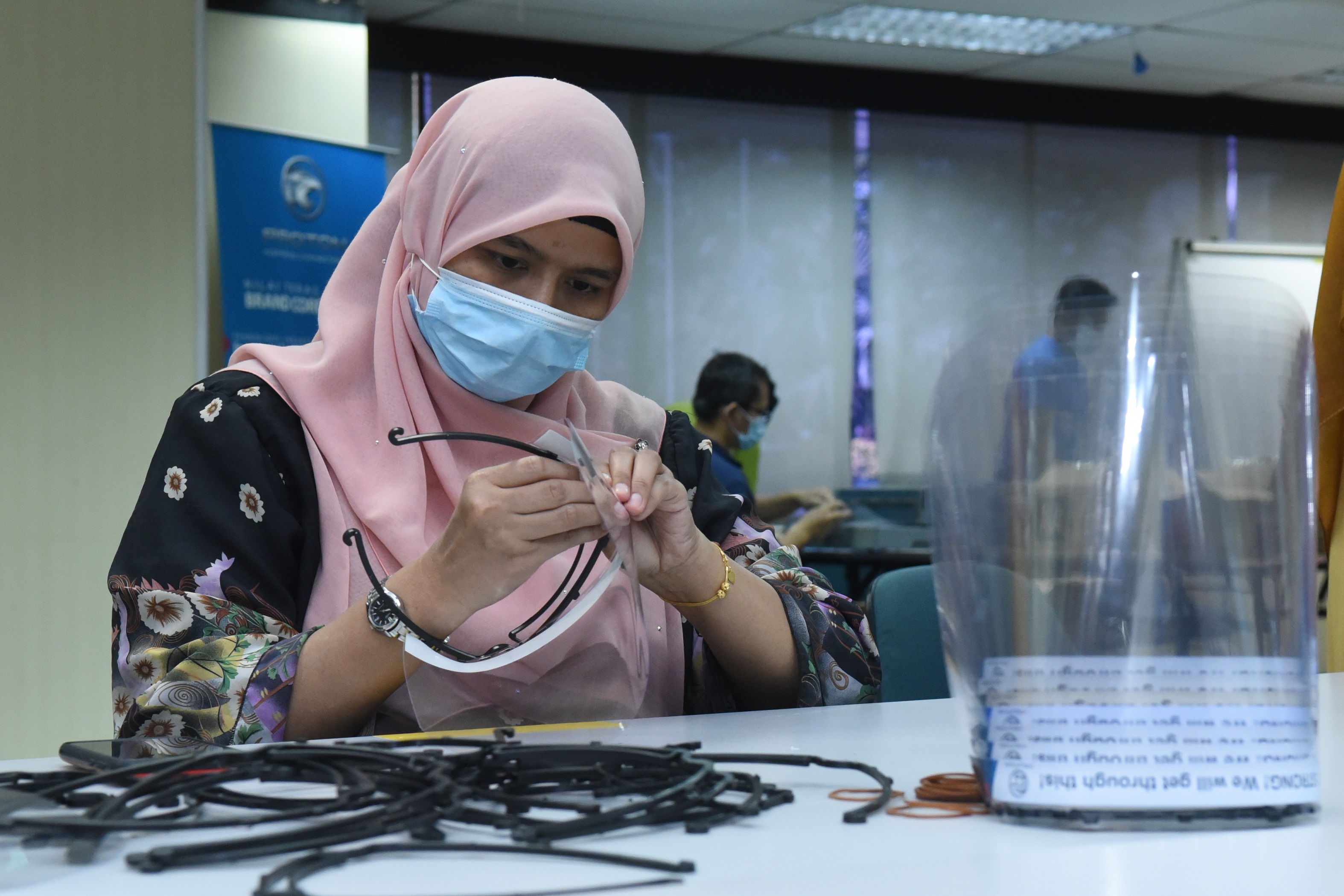 Face shields hand made by PROTON’s staff force.