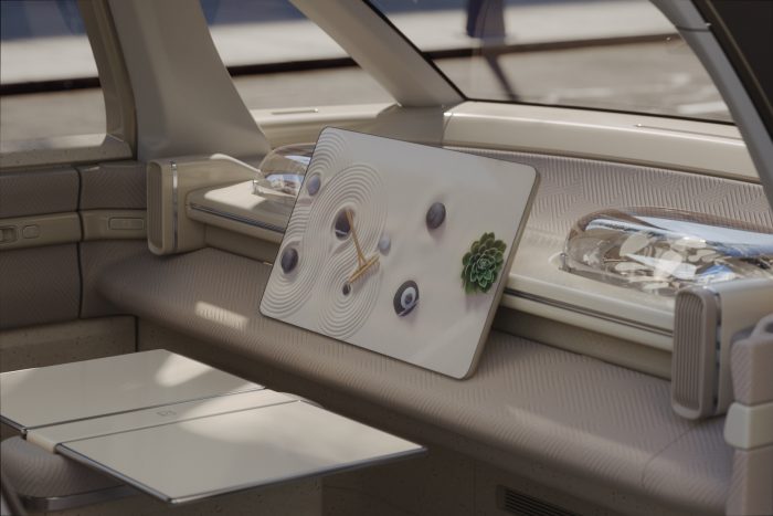 To create such a unique space, interior designers stepped away from traditional car design and looked at furniture design for inspiration. They went with an aesthetic that created minimal distraction to enhance openness and cleanliness. Speakers and air vents were hidden away, and buttons and gadgets minimized. To create further comfort, designers chose durable and high-quality wool and fabrics for the seats, with colors and patterns that remind people of home and the office.